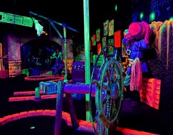 Waan je in een tropische wereld van piraterij en schurken. Magische black lights zorgen voor een spannend effect. Glow-in-the-dark minigolf is leuk voor iedereen. Jong,oud, kinderfeestjes, bedrijfsuitjes en vrijgezellenfeestjes.Glow in the dark golf wordt gespeeld zoals reguliere minigolf. Het doel is om de bal in zo weinig mogelijk slagen in de hole te spelen. Je kunt meteen een ronde glow in the dark minigolf bij Aloha reserveren. Zien we je snel?
